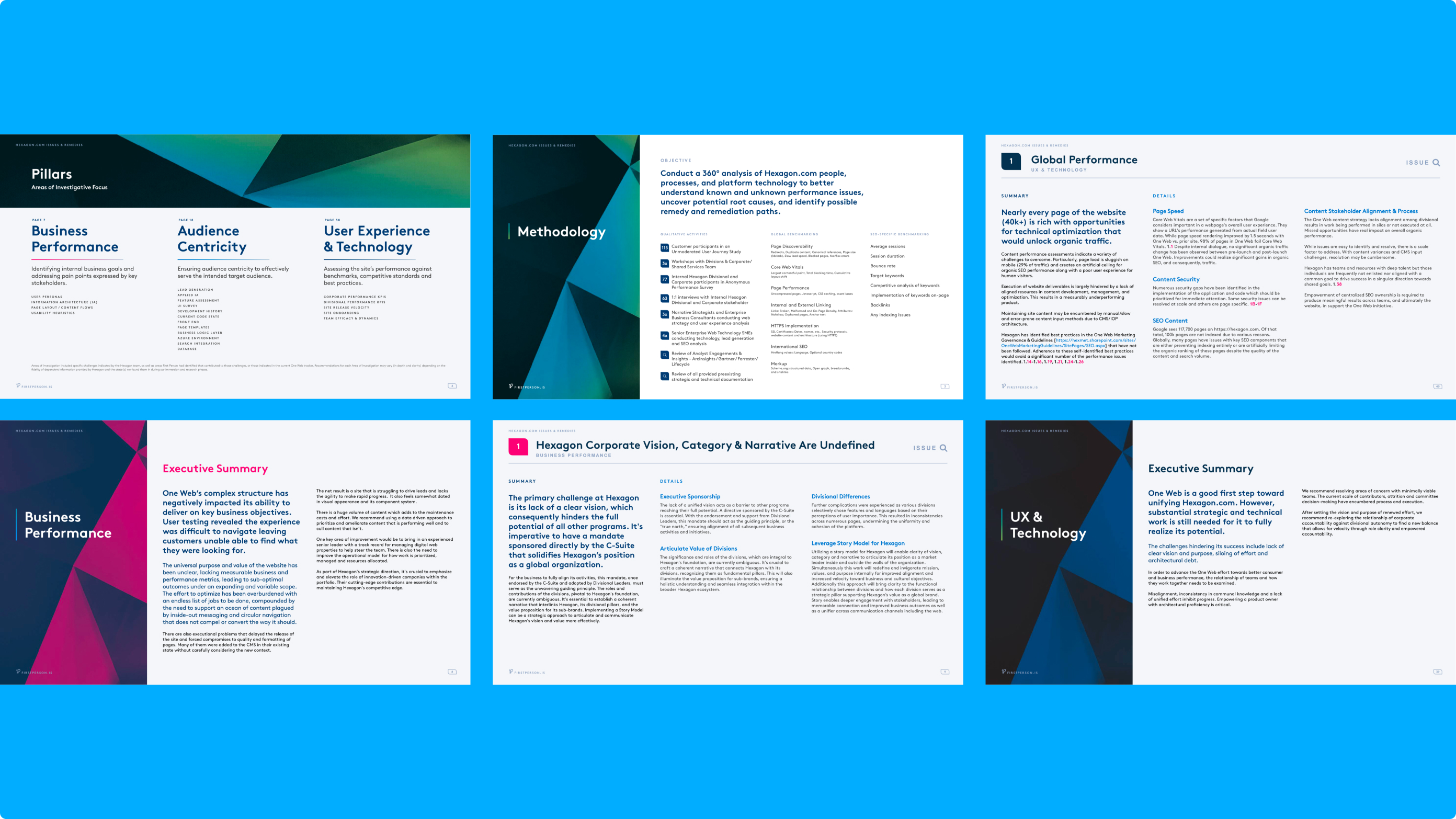 We began with a global audit—interviewing analysts, customers, and leaders across regions and business units. We mapped the friction points: siloed design systems, inconsistent messaging, and digital experiences that failed to reflect Hexagon’s enterprise value. From those insights, we built a multi-phase roadmap—first defining a unified Story, then architecting a scalable design system and flexible web structure. Every solution was designed with and for the C-suite, ensuring it could scale across product, platform, and marketing teams.
