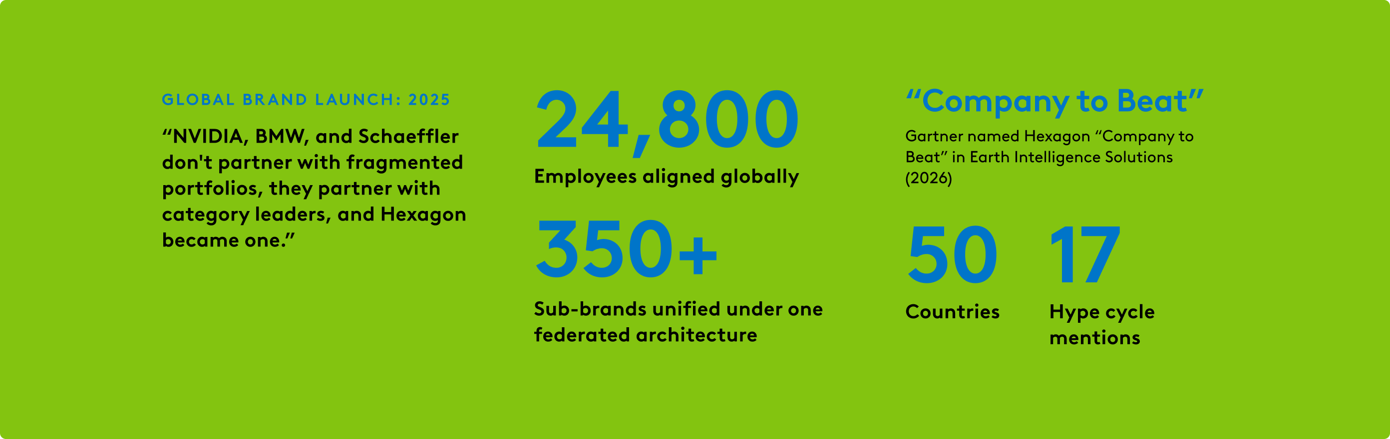 Hexagon is one of the world’s most advanced measurement companies—powering autonomy, safety, and efficiency across the industries that shape our world. But its external narrative didn’t reflect that. Internally, Hexagon had grown through acquisition, resulting in a web of respected product brands without a unified strategic story. Externally, analysts and customers described the company as “hard to understand,” with messaging that was too product-centric, too fragmented, and often diluted.